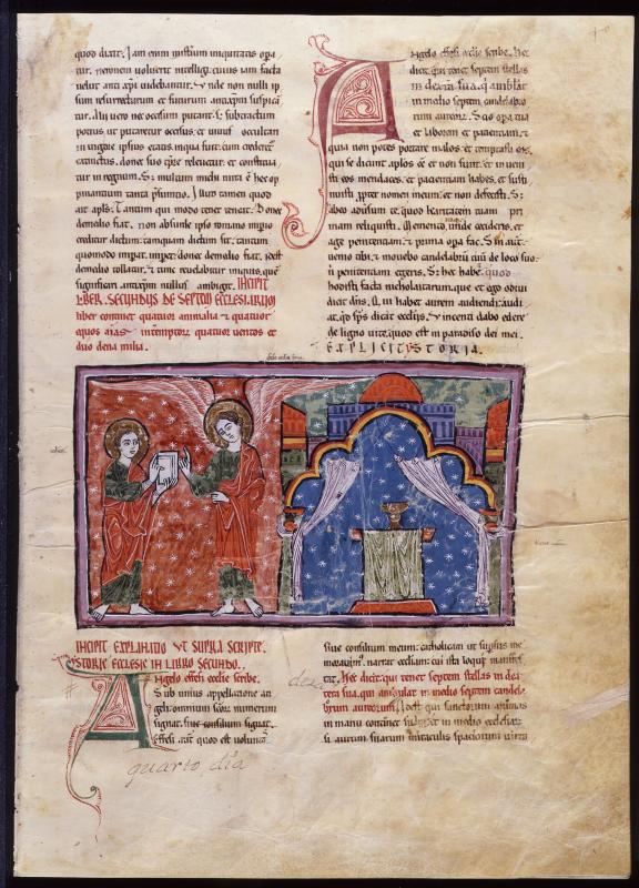 In the miniature John holds the letter in the form of a book before the Angel of the Church of Ephesus, the first of the seven churches in Asia Minor. The building is represented as a complex structure with towers and a dome. Curtains part to reveal a gold chalice—an allusion to the ritual of the Mass—on the altar.
