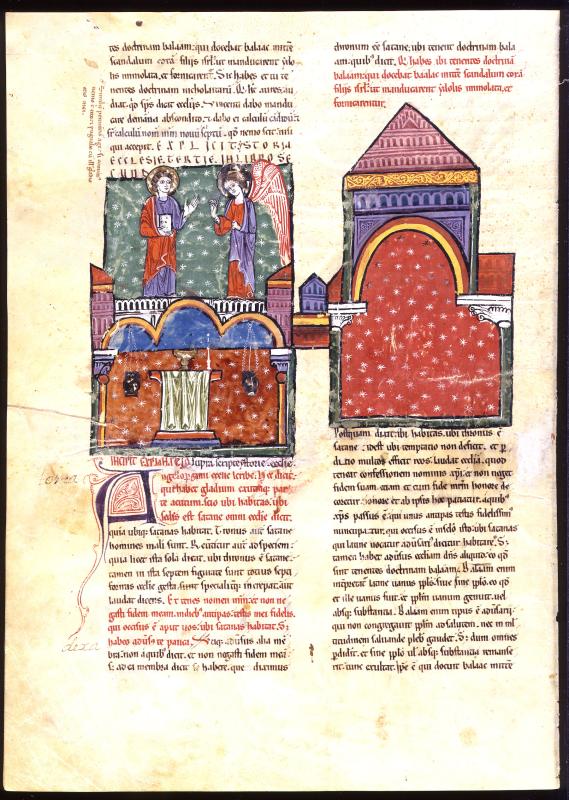 Apocalypse: John, Letter to Pergamos (Revelation 2:12-17) -- John holding book, addressed by angel, both nimbed; below, architectural setting enclosing chalice and candlestick on draped altar, and two hanging lamps; to right, church of Pergamos; starred background.