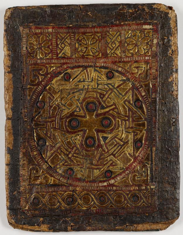 The cover pictured on this page is regarded as the finest surviving Coptic bookbinding. At its center is a cross surrounded by interlace designs composed of two intertwined squares within a circle. All these were cut from a single piece of red leather and sewn over gilt parchment. In addition, white parchment stripes were woven into the borders marking the broad decorative areas and the large circle. Small colored circles, with bright red centers, punctuate the arms of the cross, the perimeter of the large circle, and the bottom border. The use of leather tracery over the gilded background is earlier than this binding, for the identical technique is found on Coptic shoes usually dated to the sixth and seventh centuries.