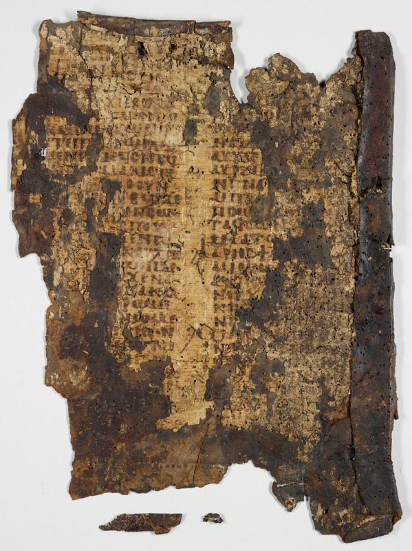 Fragments of the upper and lower covers and a papyrus board scrap of the ancient Coptic binding originally on MS M.596