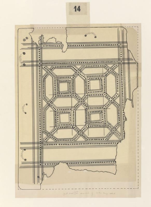 Line drawing of a partial cover of a Coptic binding, of M.596 (Petersen, part 2, Morgan no. 14)