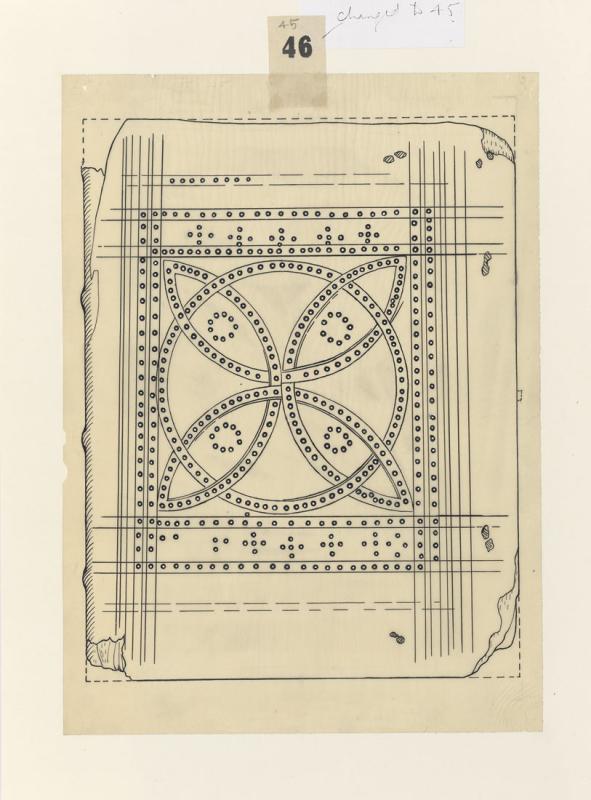Line drawing of a decorative cover and partial spine of a Coptic binding, of M.608 (Petersen, part 2, Morgan no. 45)