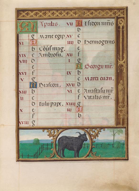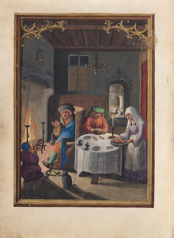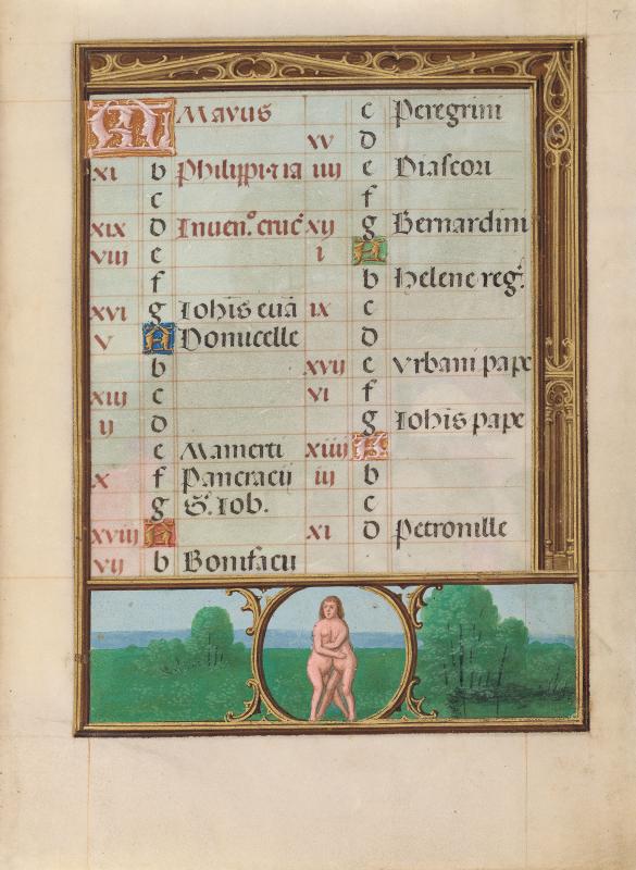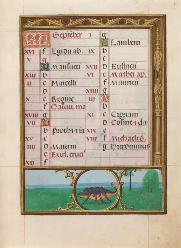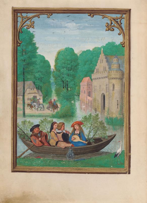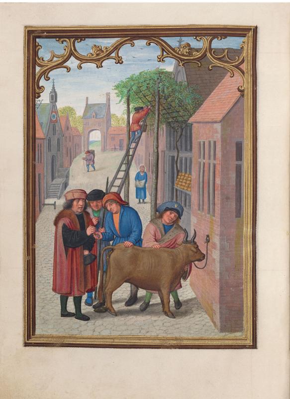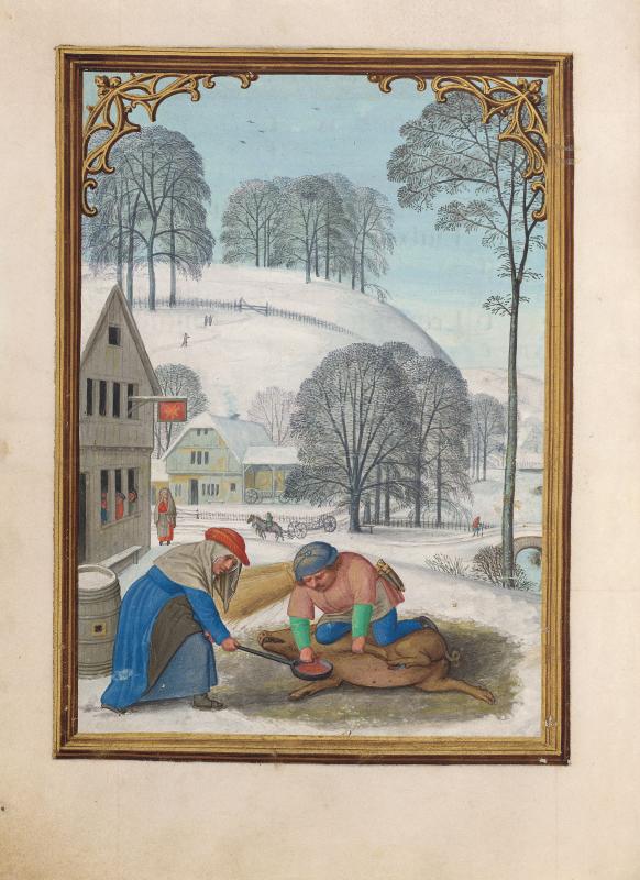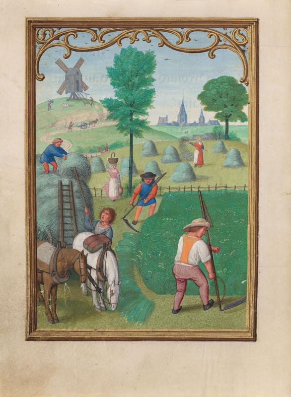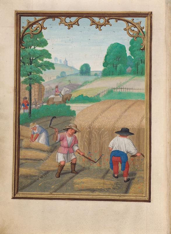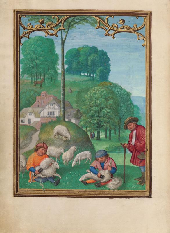 Calendars in Books of Hours were sometimes illustrated by vignettes depicting the "labors of the months," generally rural seasonal activities, such as shearing sheep in June and mowing hay in July. Bening, whose works were highly sought after throughout Europe, is usually regarded as the last great Flemish illuminator. This book was made for a member of the Portuguese Sá family, from whom it passed to King Manuel's armorer, Alvaro da Costa, after whom the manuscript is named. Bening was especially known for sensitively rendered landscapes in full-page calendar illustrations. Such cycles had not occurred in manuscripts since their initial and singular appearance almost a hundred years earlier, in the duc de Berry's Très Riches Heures, a manuscript that inspired Bening.