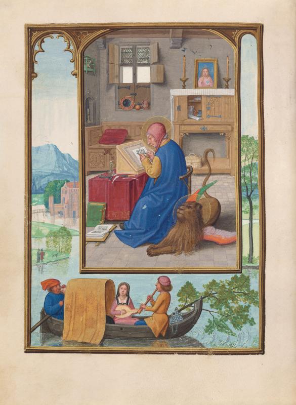 The scene is framed by a historiated border depicting two men and a woman in a boat with a canopy on a lake within a landscape. One man drinks from a jug. The woman plays a lute. The second man plays a pipe. Beside him are a canteen and a tree branch. In the background is a building with a bridge over lake.