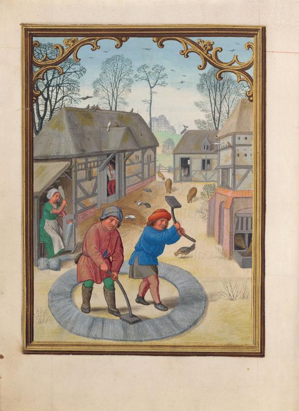Occupation of the month: November―Within a farmyard enclosed by buildings, including a dovecote, two men, within a ring of flax laid out on the ground, break flax with implements. To the left under a shed, a woman scutches flax with a scutching knife. She is seated on a chair beside a bundle of flax. A hen and pigs inhabit the farmyard. Within a building to the left, a man appears in a doorway raising an implement, possibly a flail.