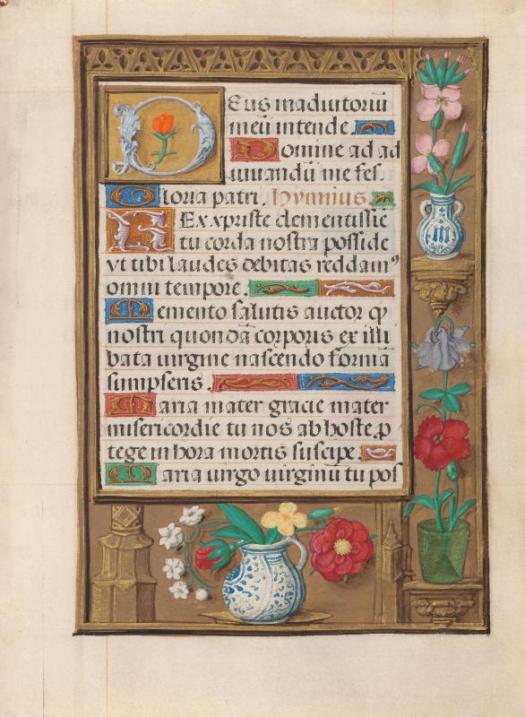 Framing the text is a border decorated in the right and lower borders with three vases of flowers in an architectural setting.