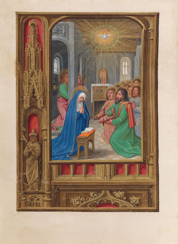 Pentecost—Within a room, the Dove of the Holy Ghost appears amid rays of light falling on apostles, all kneeling, and the Virgin Mary, who is kneeling at prie-dieu with an open book. All figures are nimbed. In the back of the room, a panel painting depicting the Crucifixion with the Virgin Mary and Evangelist John is on a draped, raised chest.