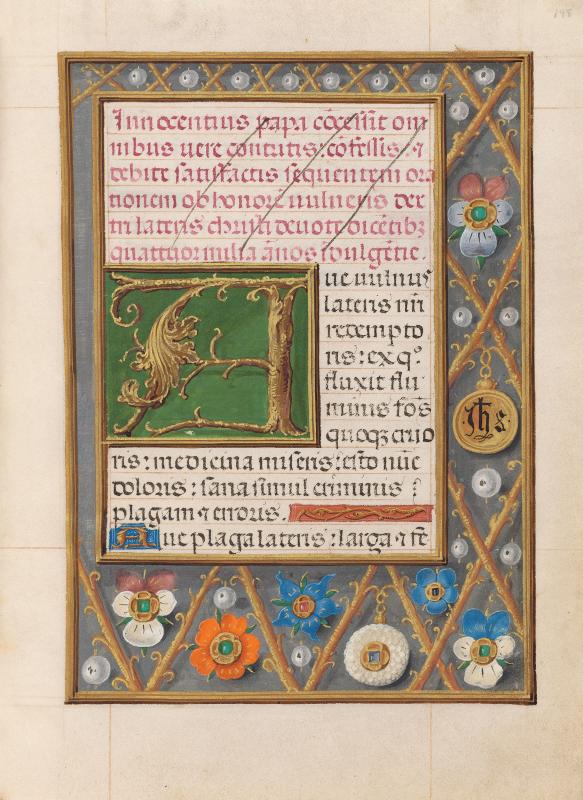 A border decorated with flowers and pearls within panels of a diamond pattern frames the text. In the right border, a pendant inscribed IHS hangs within one panel. A jeweled pendant hangs in a panel in the lower border.