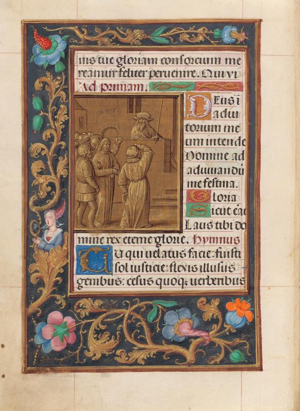 The miniature and text are framed by a foliate border inhabited by a half-figure of a woman holding a mirror.