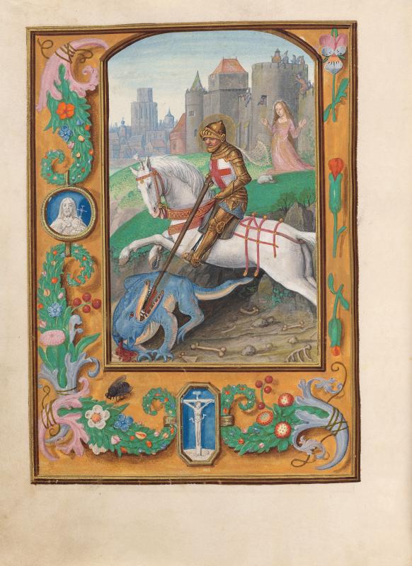 George of Cappadocia: Slaying Dragon―A nimbed George of Cappadocia, wearing armor and a white tunic inscribed with a red cross, is mounted on a horse. With a lance, he transfixes a dragon, which is lying amid bones strewn on the ground. In the distance, the Princess of Trebizond, stands on a hill raising both hands. Beyond, several figures, including a king, look on from a tower in a castle. In the background to the left are buildings of a city.
