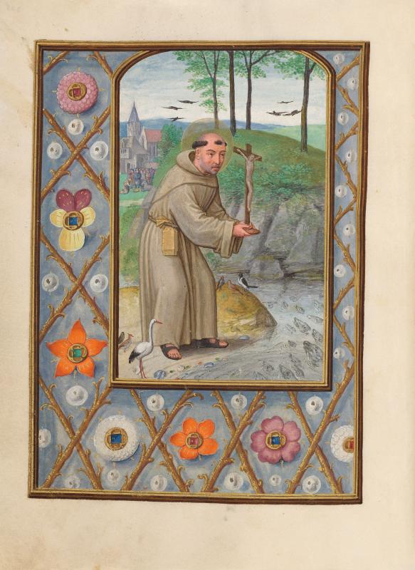 Anthony of Padua: Preaching to fishes―Within a landscape, a nimbed and tonsured Anthony of Padua, wearing a monk's habit with a pouch at the belt, raises a crucifix held in both his hands above fishes gathered in the water around him. A heron and other birds flock beside him.