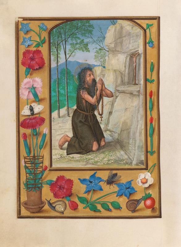Within a landscape, a nimbed Onuphrius of Egypt, wearing sackcloth, kneels with his hands joined before a crucifix in a niche of a stone wall. He holds a rosary in his right hand.