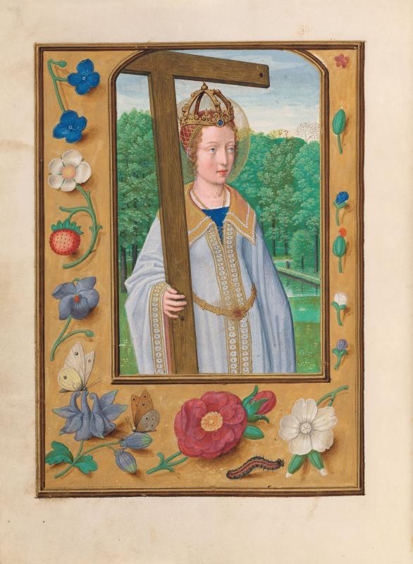 Within a landscape, a half-figure of a nimbed and crowned Empress Helenaholdsa tau cross.