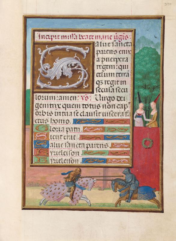 The initial S decorated with foliate ornament begins the Introit of the Votive Mass of the Virgin. Scene, Sports and Games: Jousting—In a border framing the text, two soldiers joust. They wear armor and are on caparisoned horses. From a viewing stand with a wreath, two women look on.