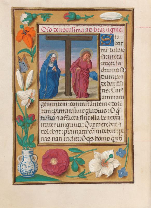 The Virgin Mary with her hands clasped and Evangelist John, raising his left hand to his cheek, are both nimbed. They flank a tau cross with nail holes at both ends of the horizontal bar and at the lower end of the vertical bar. Each hole is stained with blood. The miniature is at the beginning of the Stabat Mater.