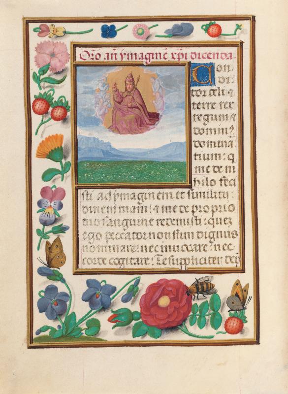 God, nimbed and wearing a triple-crowned tiara surmounted by a cross, appears surrounded by angels above a landscape in an arc of heaven. He raises His right hand in blessing and holds a scepter in His left hand. The miniature is at the beginning of the Conditor celi et terrae rex. The miniature and text are framed by a border decorated with flowers, including viola, strawberries, and a rose, and inhabited by butterflies and a bee.