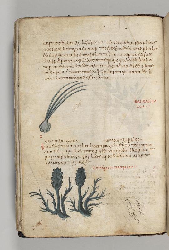 2) Asparagus (Asparagus officinalis), inscribed aspharagos petraios.