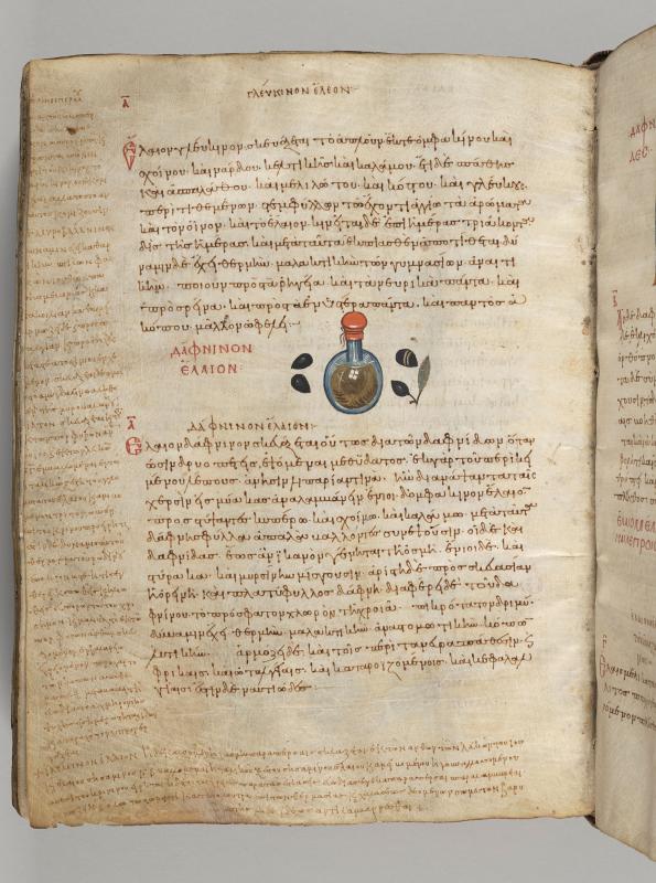 Berries and leaves flanking container of oil of sweet bay, inscribed daphninon elaion.