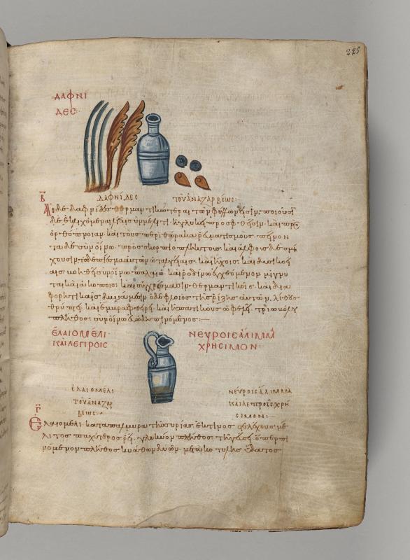 1) Leaves and berries flanking container of oil of bayberries, inscribed daphnides;