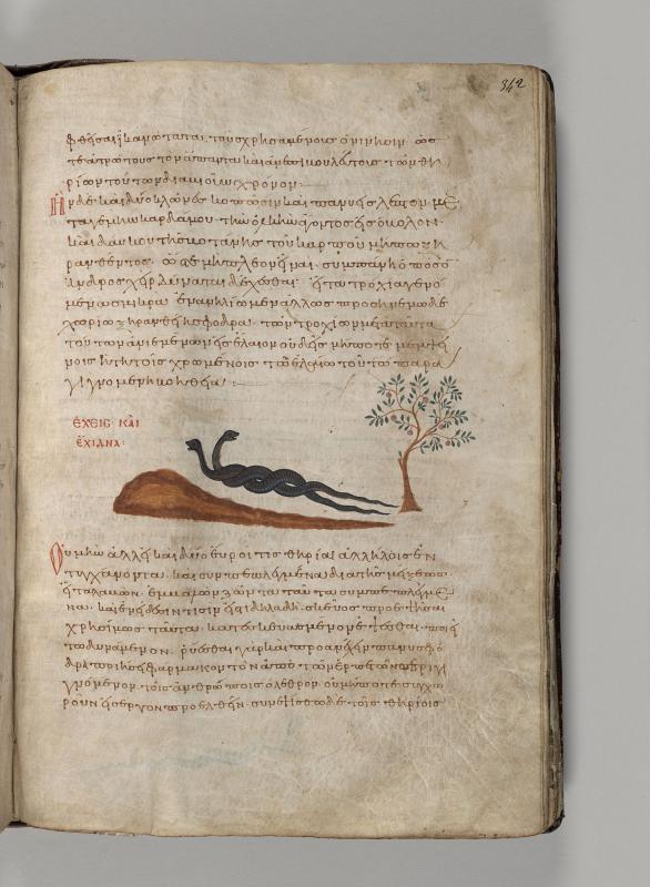 Male and female vipers, inscribed echeis kai echidna, and flowering plant.