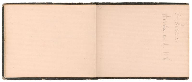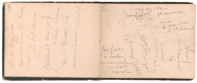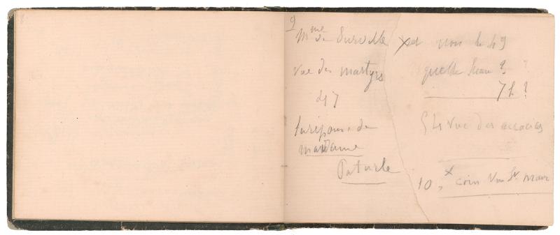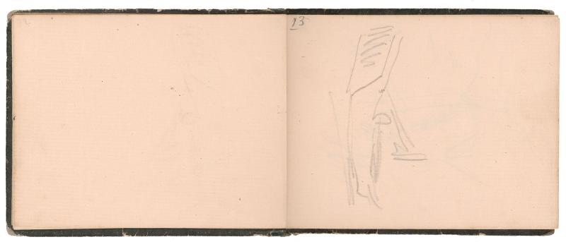The notebook is small (10.9 x 14.1 cm), bound with a leather spine and embossed paper-covered boards, and heavily worn from frequent use. The inside front cover bears a label of the stationer J. Mèche, located at 189 rue Saint-Honoré, across from the Church of Saint-Roch, just steps from the Tuileries Gardens. Manet filled about 38 of the notebook’s 102 pages, leaving many blank. The volume once belonged to the author and critic Adolphe Tabarant (1863–1950), who made his own notes on some of the pages and inserted two sheets identifying Manet’s illustrations, in some instances incorrectly. Tabarant also added the label on the notebook’s front cover, identifying it as Manet / Carnet de notes. (1860–1862) / Nombreuses adresses, notamennent de modèles. Et quelques croquis. (Manet / Notebook. (1860–1862) / Many addresses, including models. And some sketches.)