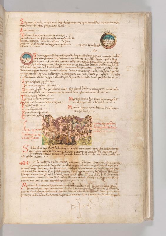 Written and illustrated in Naples, Italy, shortly after 1498, Fasciculus temporum is a compendium of four late medieval chronicles. The first, Fasciculus temporum, after which the manuscript takes its name, is a summary of world history compiled by the German monk Werner Rolevinck. His text and the thirty pen-and-wash drawings are based on the printed edition with woodcuts published by Erhard Ratdolt in Venice in 1481.