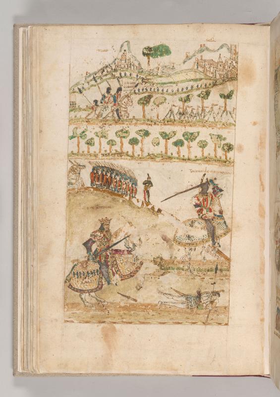 Cronaca della Napoli Aragonese: Scene, Ferdinand of Naples fighting Giacomo di Montagano -- In foreground, Ferdinand, inscribed LO S(IGNOR) RE FERRANTE, crowned, wearing armor holding sword with right hand is astride rearing, caparisoned, horse pursuing Giacomo di Montagano, inscribed IACOUO DE MONTAGNA, wearing helmet and armor, raising sword with left hand, astride caparisoned horse. Soldier, shield at left shoulder, holding or transfixed by spear, sword at waist, reclines on ground between them near dagger.