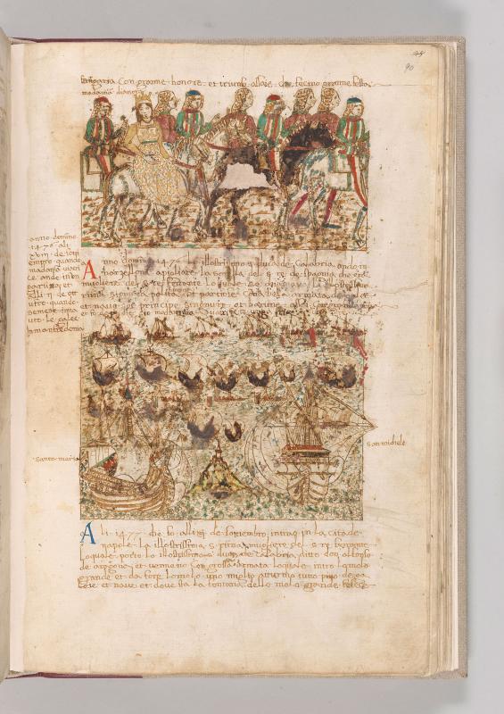 Cronaca della Napoli Aragonese: Scene, Alfonso II of Naples arriving in Barcelona -- Ships sailing; flanking hilly island surmounted by building, two foremost ships named by inscriptions in margins SANTA MARIA (left) and SAN MICHELE (right).