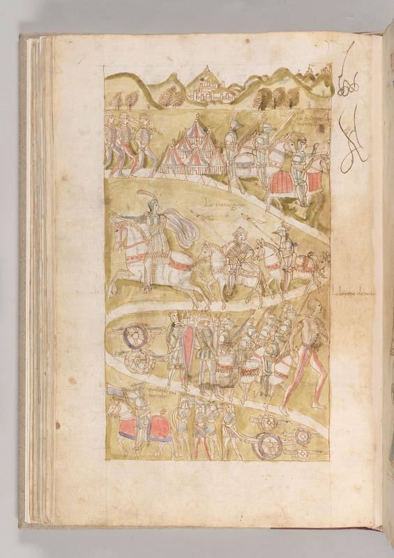 Cronaca della Napoli Aragonese: Scene, Liberation of Otranto -- In landscape, buildings of city or castles in valley and atop hills, army on winding road including: three foot-soldiers, carrying spears on left shoulders, two with right hands on swords at waists approaching camp of five tents; three soldiers wearing plumed helmets and armor, astride horses, the foremost blowing trumpet astride caparisoned horse, below inscription LO SIGNOR CONTE DE MONTELLO.