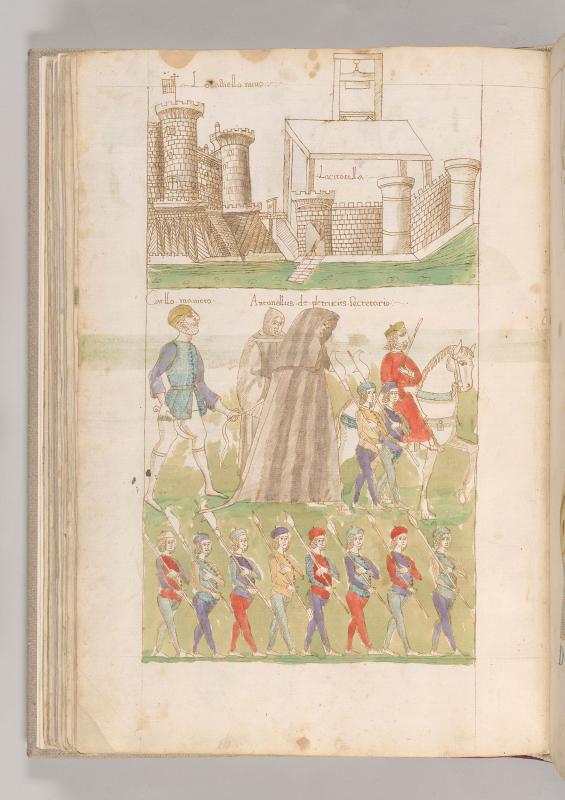 Cronaca della Napoli Aragonese: Scene, Antonello Petrucci led to Execution -- Above, Castel Nuovo, inscribed LO CASTIELLO NUUO with towers, one with banner surmounted by cross. The castle is connected by bridge to section inscribed LA CITATELLA, where crennelated walls enclose platform on which is guillotine. Silouette of soldier, wearing plumed helmet, holding spear stands in portal at end of walkway.