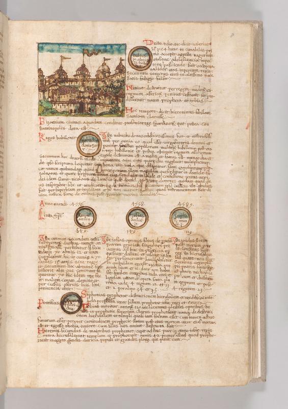 City of Constantinople with buildings, some domed, four with banners, enclosed within wall.