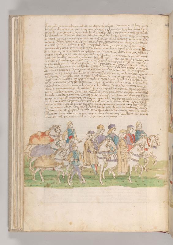 Cronaca della Napoli Aragonese: Scene, Coronation of Alfonso II of Naples -- Three men, wearing hats, holding rods with left hands, grasping reins of three horses with right hands, walk behind procession of six nobles, wearing hats, all astride bridled horses.