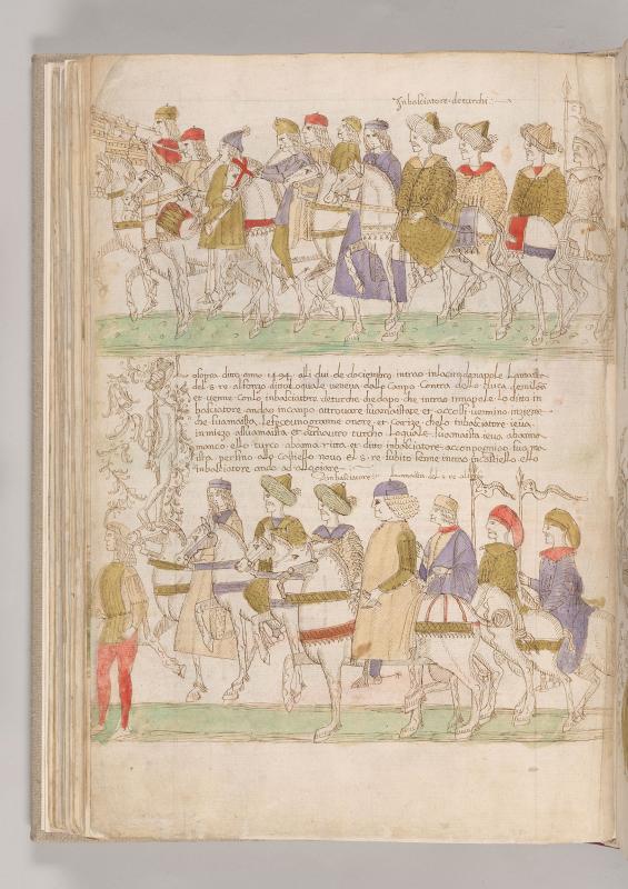 Cronaca della Napoli Aragonese: Scene, Ambassador of Turkey entering Naples -- Turkish ambassador, inscribed INBASCIATORE DE TURCHI, wearing turban-like hat, astride bridled horse, is accompanied by ten horsemen, three blowing trumpets, two bannered; one playing pipe and tabor; two others wearing turban-like hats; and one, wearing soft hat, carrying bannered lance.