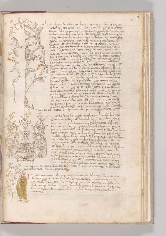 Initial U of two hybrid men, bodies terminating with floreate vines, flanking fountain (?) with nude winged figure, foliate ornament emerging from head, standing in center.
