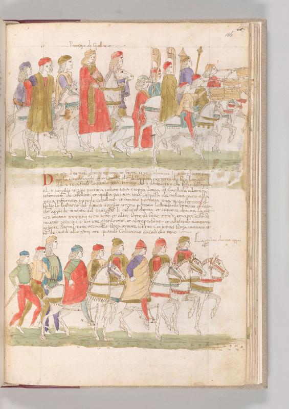 Cronaca della Napoli Aragonese: Scene, Goffredo Borgia entering Naples -- Goffredo Borgia, inscribed PRENCIPE DE SQUILLACIE, wearing hat, is astride bridled horse amid three men walking, and eight (?) horsemen, all wearing hats, two carrying banners, two with ceremonial maces and three blowing bannered trumpets.