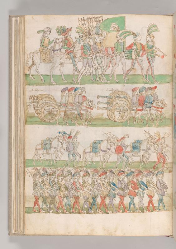 Cronaca della Napoli Aragonese: Scene, French entering Naples -- Continues parade of previous folios in four registers: