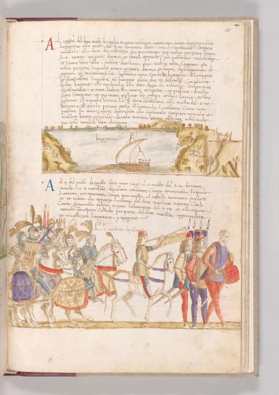 Cronaca della Napoli Aragonese: Scene, Expedition of Fernando Francesco d'Avalos -- Fernando Francesco d'Avalos, inscribed LO S(IGNOR) MARCHESE DE PESCARA, wearing plumed helmet and armor, holding sword with right hand is astride bridled, caparisoned horse, amid soldiers wearing plumed helmets and armor, some raising swords, some carrying lances, astride bridled caparisoned horses. Preceding them, at right, are man blowing bannered trumpet possibly decorated with heraldry of Aragon, astride bridled horse with trappings; group of men carrying spears and swords; and man playing pipe and tabor.