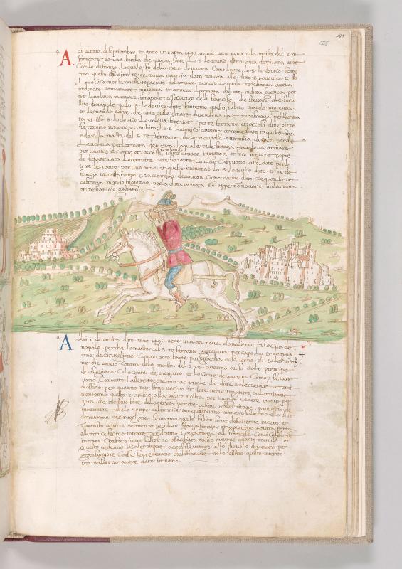 Cronaca della Napoli Aragonese: Scene, Liberation of Naples -- Man wearing plumed hat, blowing horn, grasping reins and riding crop, or whip, with right hand, astride bridled horse with trappings, purse hanging from saddle, gallops through landscape with buildings.