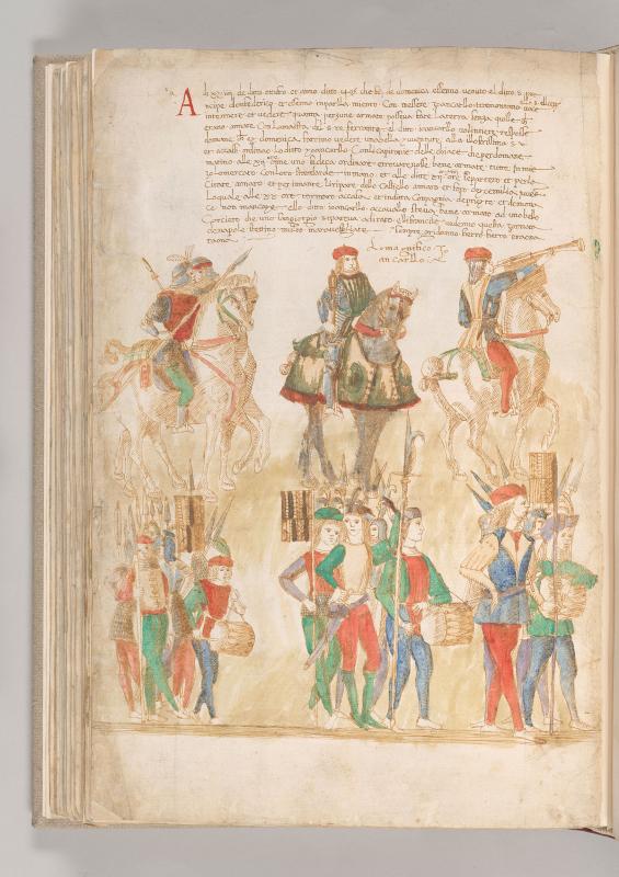 Cronaca della Napoli Aragonese: Scene, Aragonese Troops -- In upper half, of four soldiers astride horses, two hold lances and lean toward each other; Giancarlo Tramontano, inscribed LO MAGNIFICO JOAN CARLLO, holds ceremonial mace astride caparisoned horse; fourth blows bannered trumpet decorated with heraldry of Aragon.