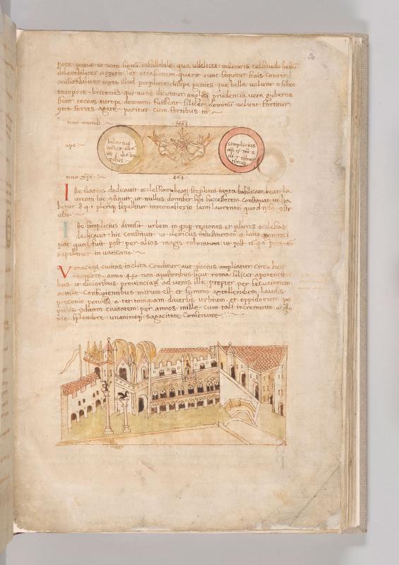 Venice, showing San Marco next to Doge's palace at right with bird, or statue of bird, atop arched opening on balcony; bridge at right; canal in foreground. Two columns at edge of piazza, one surmounted by Theodore the General, extending one hand to dragon, holding staff (?) with other hand; second column surmounted by winged lion, symbol of Evangelist Mark.