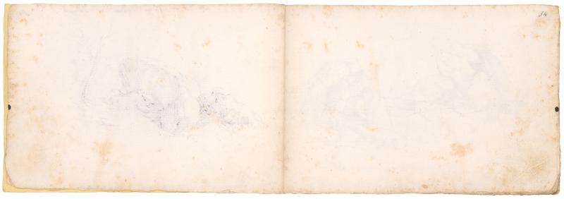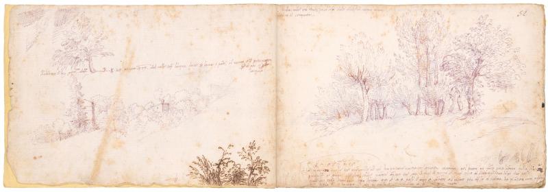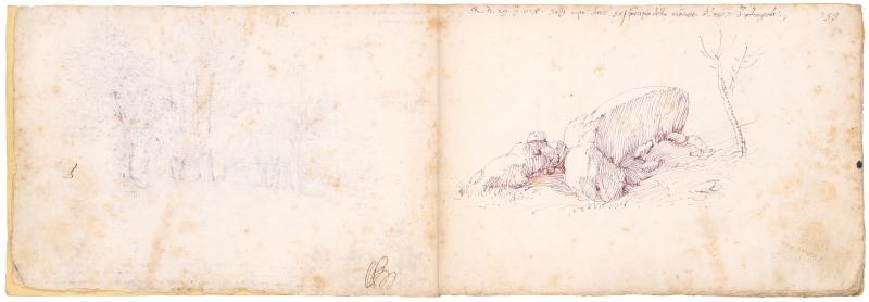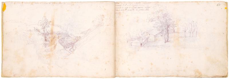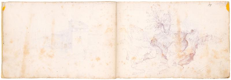 The drawings are in pen with violet and brown ink, also occasionally including a blue wash. They depict idyllic homes and villages amid their natural landscapes, as well as some of Cibo’s geological and botanical studies. In the early pages of this sketchbook, three rock studies reflect a careful articulation of planar surfaces, while later folios present quick, graphic line-work in the depiction of plants and simple landscapes. Similarly, the sketchbook’s architectural studies are equally varied, ranging from single structures among rolling hills and trees to complex drawings of entire villages from an elevated vantage point.