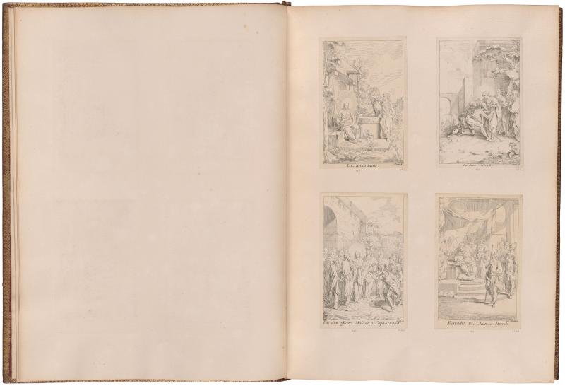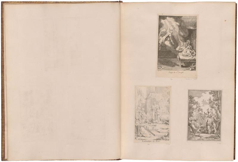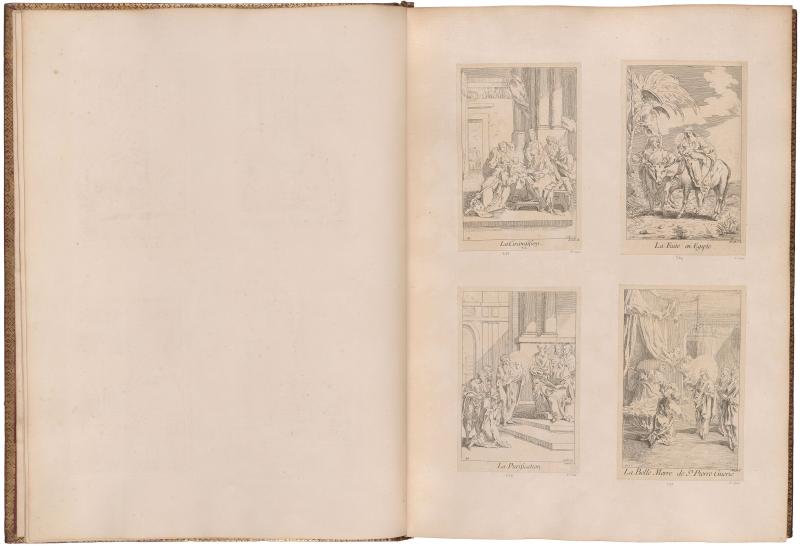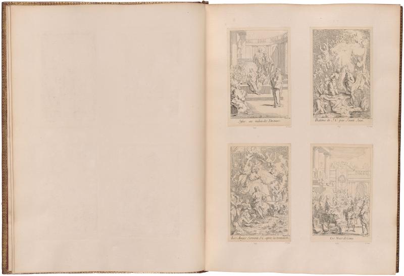 Following Gillot’s death in 1722, the contents of his studio were sold and a large number of unfinished plates were acquired by print dealers, who finished them and published the prints throughout the 1720s and 30s and beyond. These print series were gathered into albums for sale to collectors around mid-century. Because the plates came directly from Gillot’s estate, albums often contain retouched proof impressions and proof states made while Gillot was working on the plates. These rare states are evidence that Gillot was more ambitious as a printmaker than the number of works in circulation during his lifetime would suggest. The Morgan’s album, containing 586 prints by and after Gillot mounted on 100 leaves, was bound in red morocco in Paris around 1750. After it was acquired by the Duke of Newcastle, his arms were added to the cover.