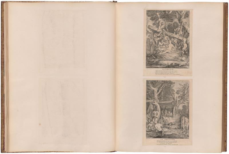 Following Gillot’s death in 1722, the contents of his studio were sold and a large number of unfinished plates were acquired by print dealers, who finished them and published the prints throughout the 1720s and 30s and beyond. These print series were gathered into albums for sale to collectors around mid-century. Because the plates came directly from Gillot’s estate, albums often contain retouched proof impressions and proof states made while Gillot was working on the plates. These rare states are evidence that Gillot was more ambitious as a printmaker than the number of works in circulation during his lifetime would suggest. The Morgan’s album, containing 586 prints by and after Gillot mounted on 100 leaves, was bound in red morocco in Paris around 1750. After it was acquired by the Duke of Newcastle, his arms were added to the cover.