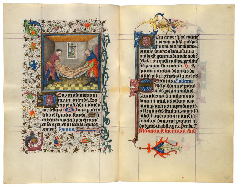 The man in the previous miniature has died. His corpse is lowered to the floor upon which straw has been spread to absorb any bodily fluids. The dead body will be washed and sewn into a shroud.