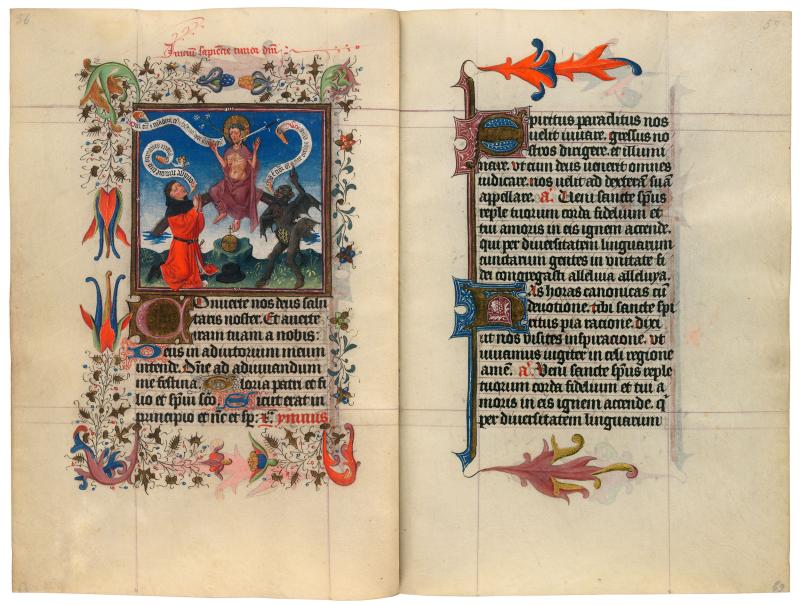 The seventh and last gift of the Holy Spirit is fear of the Lord. It is illustrated with a portrait of Catherine's husband, Arnold, praying to Christ of the Last Judgment (the sword of justice and lily of mercy spring from the Savior's mouth). Arnold invokes Psalm 118, verse 120: "Make my flesh tremble from fear of the Lord." The devil, however, countermands from Psalm 35, verse 2, arguing that "There is no fear of the Lord before God's eyes." Christ's rather neutral reply is from Ecclesiastes (12:13): "Fear God and follow his commandments; this is true for all men." These sequential portraits of Catherine and Arnold place the duchess, who commissioned the manuscript, and her husband, the duke, in starkly contrasting contexts.