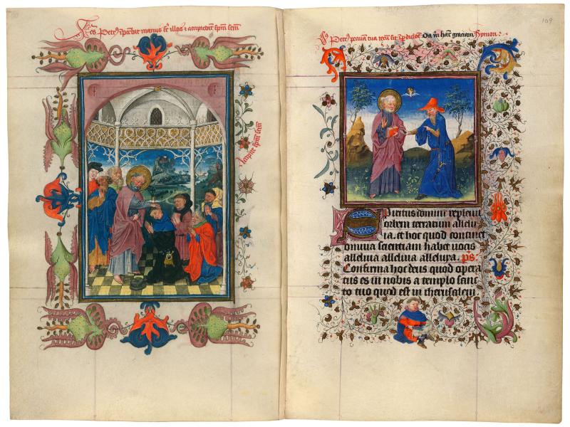 This small miniature illustrating the Mass of the Holy Spirit depicts the magician Simon's attempt to buy from St. Peter his power (he had seen the apostle bestowing the Holy Spirit upon people). The rare scene is explicated by texts (derived from Acts 8:19–20) in the top margin. Simon, shoving a moneybag toward the saint, demands, "Give me this grace," to which Peter calmly responds, "You and your money will perish." How the boy shearing a sheep in the bottom border might relate to this scene is a mystery.