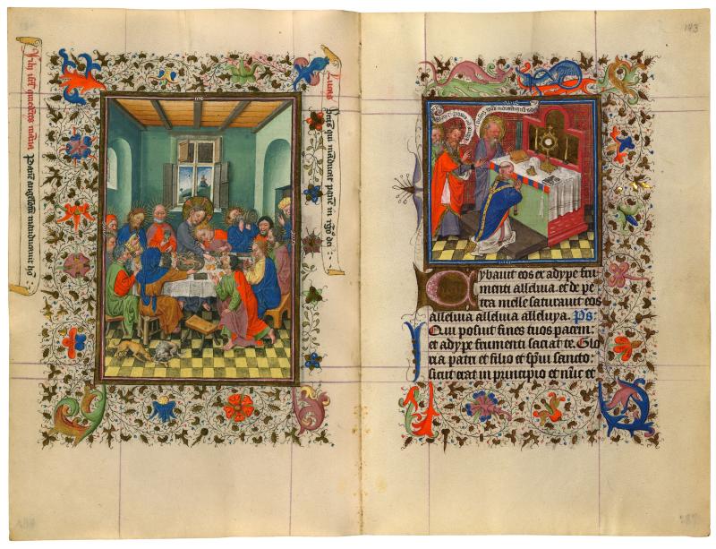 This large miniature marking the Mass of the Blessed Sacrament illustrates the Last Supper. Christ gives Judas the sop by which he identifies his betrayer; as Judas accepts this, a tiny demon enters his mouth. (John, leaning on the Savior's chest, sleeps through the critical moment, while Peter, to the left of Christ, appears aghast.) Biblical quotations interpret the event. The left one, from Psalms (77:25), refers to the "bread of angels," a phrase applied to the Eucharist. The right quotation, from Luke (14:15), praises those who have eaten bread in the kingdom of God. In the smaller miniature, representing the mystical union of the Old and New Testaments, Moses and St. Paul observe the celebration of Mass.
