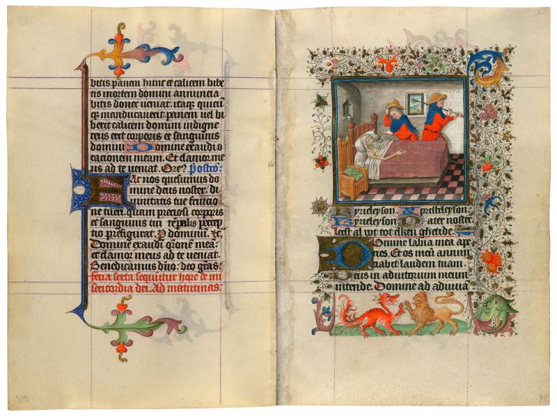 The rare Friday Hours of the Compassion of God plus the Mass of the Holy Cross are illustrated with a series of nine images, all of which are exhibited here. (Two introductory large miniatures for the Hours and the Mass are missing.) The iconography of the medieval legend of the True Cross offers an imaginative link—physical and metaphysical—between Adam and Christ and between terrestrial and celestial Paradise. The cycle begins with a remorseful Adam, on his deathbed, sending his third son, Seth, to the Garden of Eden to fetch a branch of the Tree of Mercy.