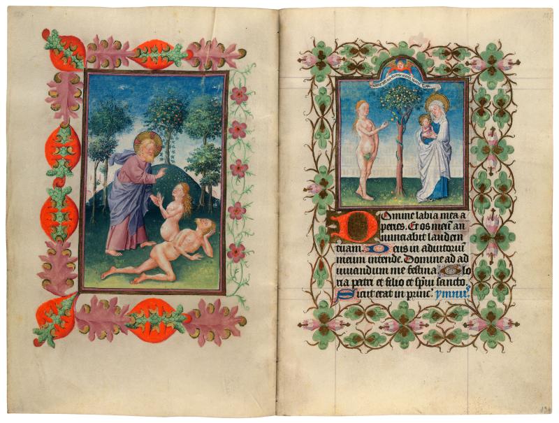 The Saturday Hours of the Virgin begin with this full-page miniature of the Creation of Eve. In the verdant Garden of Eden, a blond God pulls an equally blonde Eve from the side of a fair Adam. All is light and bliss. Eve's creation starts the illustrative cycle for the Saturday Hours of the Virgin because she is the mother of sin, and her downfall necessitated the arrival of the "New Eve," that is, the Virgin. Mary will be the mother of Christ, the Savior through whom mankind will be cleansed of the Original Sin of our first forebears.