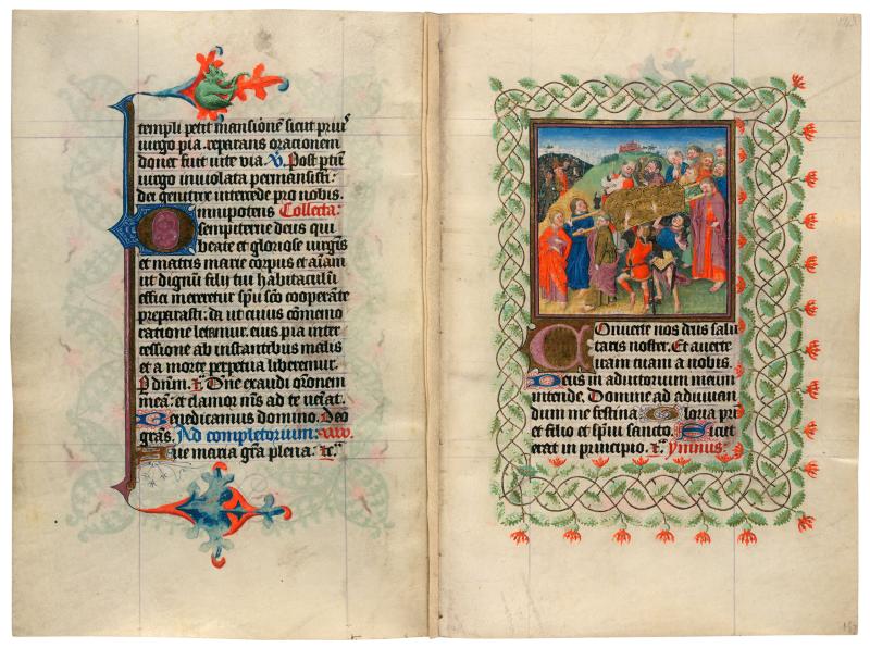 The Virgin's funeral cortege consists of the twelve apostles. John, with a palm, leads the way; Peter sprinkles the cloth-covered coffin with holy water; and Paul censes it. At the left, the priest Jephonias hides behind a hillock with a group of soldiers. Two other soldiers have tried to stop the procession by toppling the coffin, but their hands miraculously stick to it; indeed, the hand of one soldier is severed from his wrist.